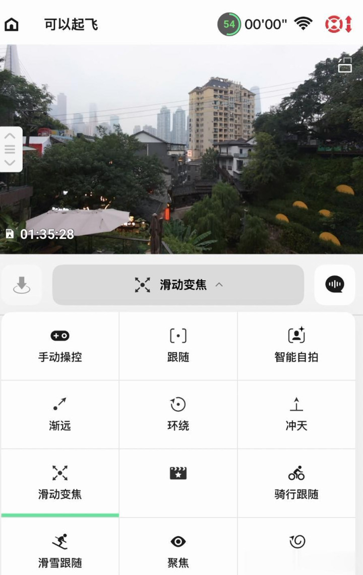 底部按键可以切换飞行模式,同时,手机 App 上的画面也会实时同步。