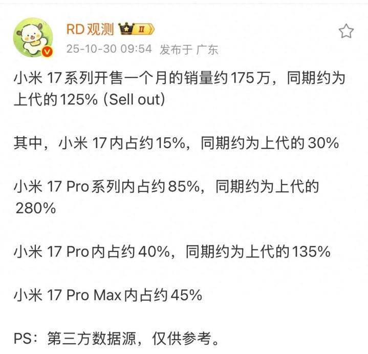 RD观测在社交媒体平台发布的数据表明,小米17系列开售一个月销量约为175万台,相比上代同期增长25%。