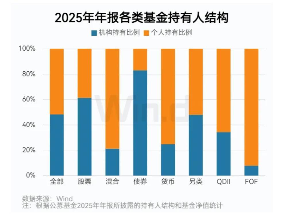 和债券基金不同,个人投资者成为投资主力军的是公募FOF产品。根据Wind统计,截至2025年末,FOF的个人持有比例达到了92.20%。具体看,纳入统计的973只FOF,有740只个人投资者持有占比在80%以上,其中的693只个人投资者持有占比在90%以上,占比超过七成。