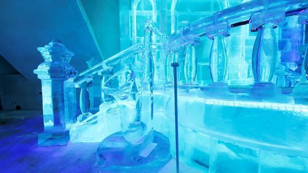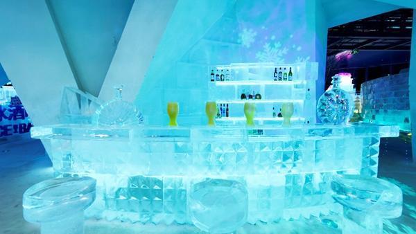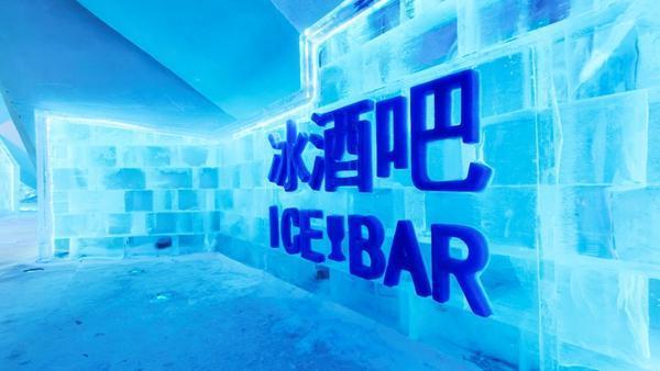 “冰酒吧”位于梦幻冰雪馆的“极境-极地世界”主题区域,将冰雪艺术与休闲体验深度交融。这里处处彰显着冰雕师的匠心独运,墙壁、吧台、座椅、楼梯、乐池等均由真冰雕刻而成,与红、蓝、紫、金等色调的灯光相映成趣,更显绮丽梦幻。“冰酒吧”不止是冰雕艺术的展示,更是沉浸式体验的狂欢场。