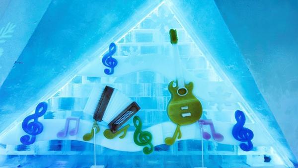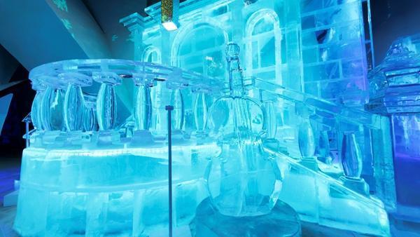 “冰酒吧”里还摆放着萨克斯、大提琴、吉他和手风琴。这些乐器全部由真冰精雕细琢而成。其中,萨克斯和大提琴采用透明冰雕刻,吉他和手风琴采用植物彩色冰雕刻。每一个冰雕乐器中还放置了特殊的感应装置,可以与游客进行互动。当游客手持特制的魔法棒,指向哪个乐器,哪个乐器便会自动播放该乐器演奏的乐曲,悦耳动听又趣味十足。