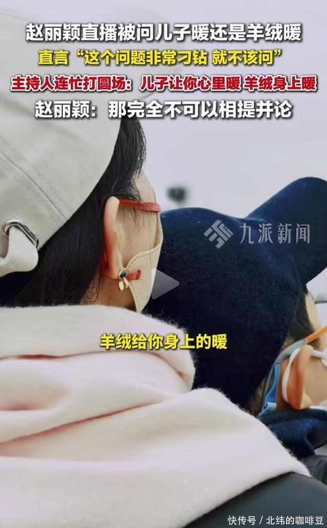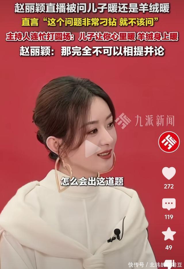 10月13日,赵丽颖在某品牌直播中,被主持人突然提问。 “儿子暖还是羊绒暖” 赵丽颖当时的脸色立马有了变化,当场愣住,她也没有想到主持人能够问出这么样的问题。 回过神之后,直接对着主持人说。 “这问题就不该问,这个问题非常的标准,而且这个问题就属于不该问的。” 赵丽颖在说这些话的时候,表情也是十分淡定。